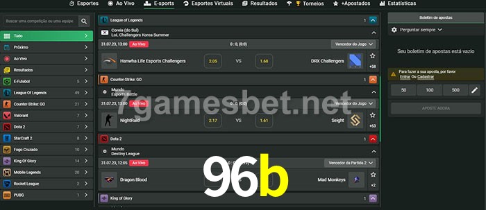 O 96b oferece uma grande seleção de opções de apostas em e-sports com probabilidades competitivas